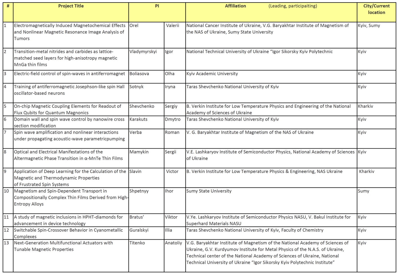 За результатами конкурсного відбору, проведеного визнаними міжнародними експертами, у 2026 році для фінансування було обрано 13 дослідницьких проєктів. Фінансова підтримка буде надана 47 дослідникам у галузі магнетизму, серед яких представники установ Національної академії наук України: Інституту магнетизму імені В.Г. Бар’яхтара, Київського академічного університету, Фізико-технічного інституту низьких температур імені Б.І. Вєркіна, Інституту фізики напівпровідників ім. В.Є. Лашкарьова, Інституту надтвердих матеріалів ім. В.М. Бакуля, Інституту металофізики ім. Г.В. Курдюмова, Технічного центру. Профінансовані проєкти будуть виконуватись у науково-дослідних установах Києва, Харкова та Сум. Загалом же у 2025 році надійшло 37 заявок на участь у конкурсі.